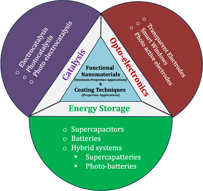 - Fabrication of hybrid nanostructures and their multifunctional properties (electronic, optical, electrochemical, photoelectrochemical, etc.) and their application for energy harvesting and storage applications.